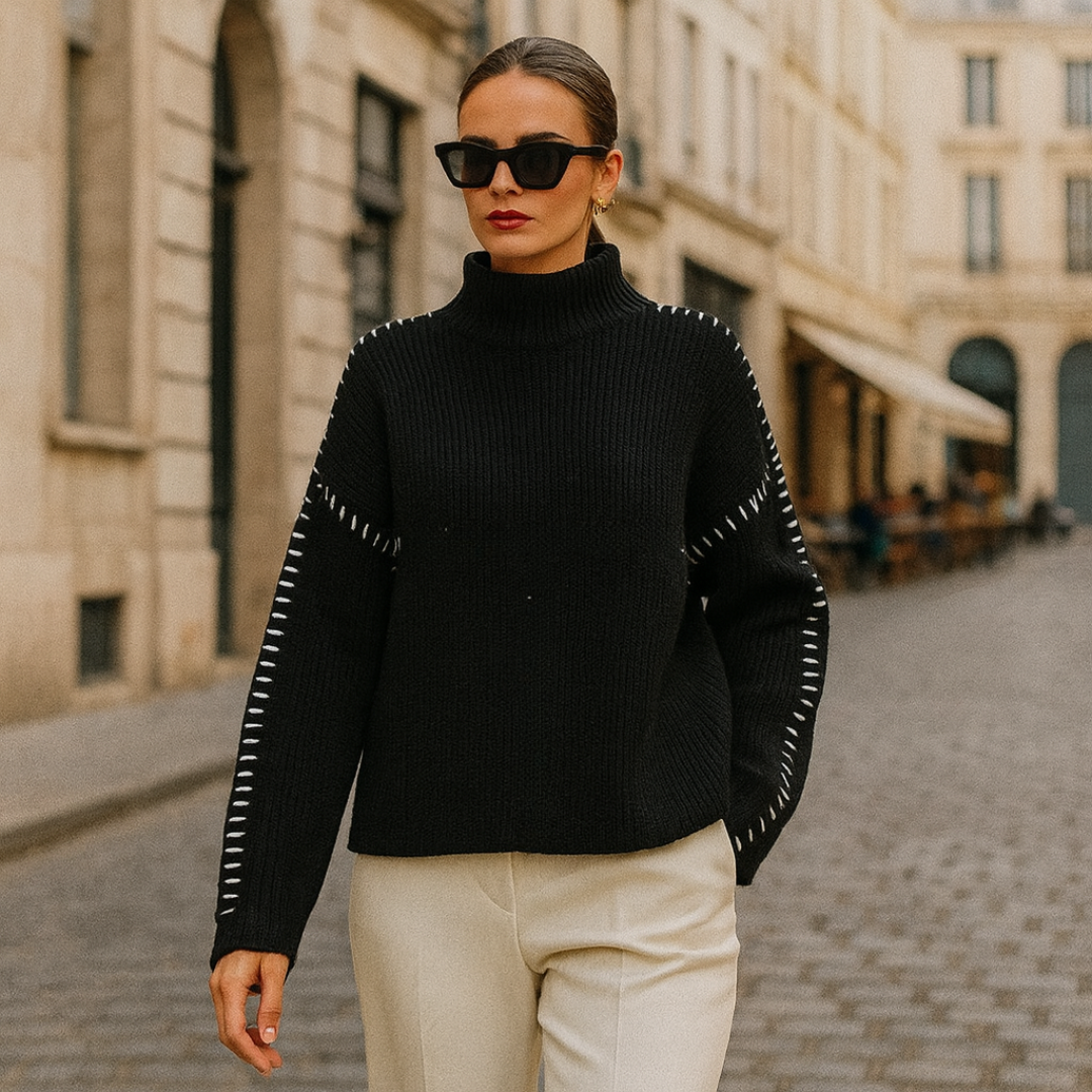 De opvallende contrasterende stiksels langs de mouwen en het lichaam geven de trui een elegante maar trendy touch.