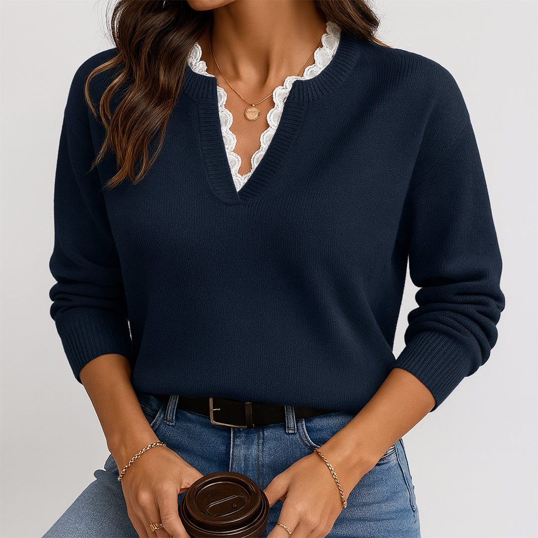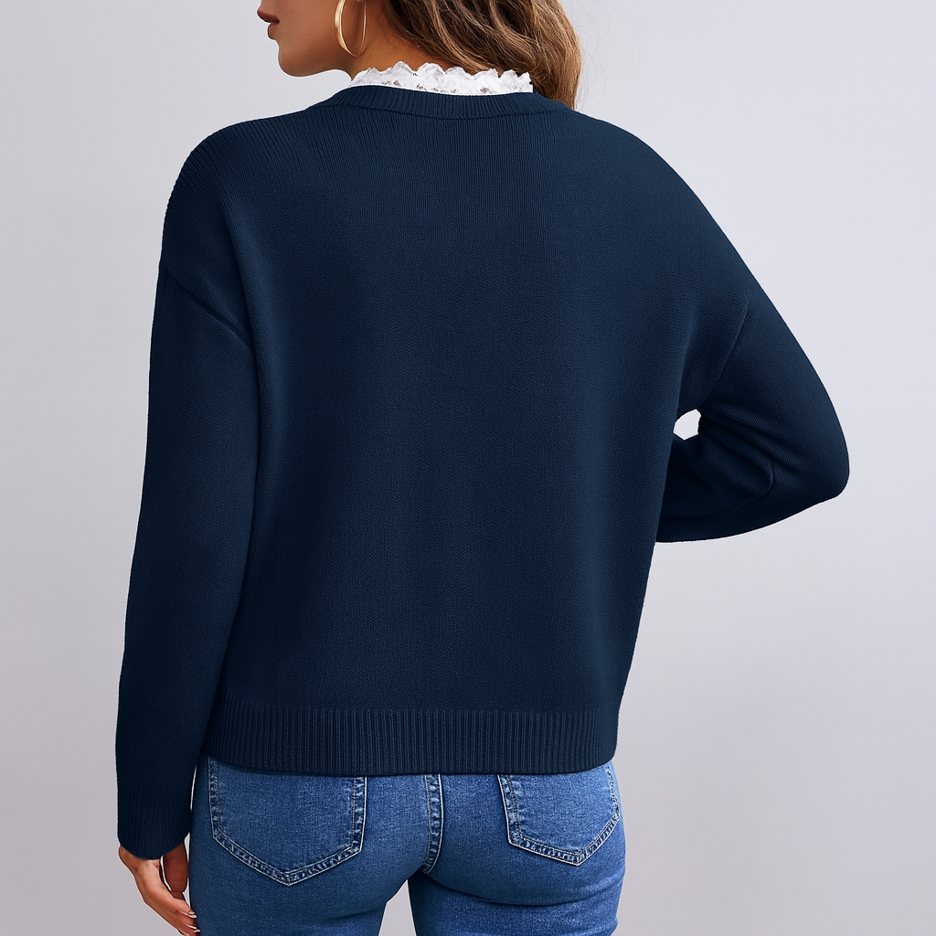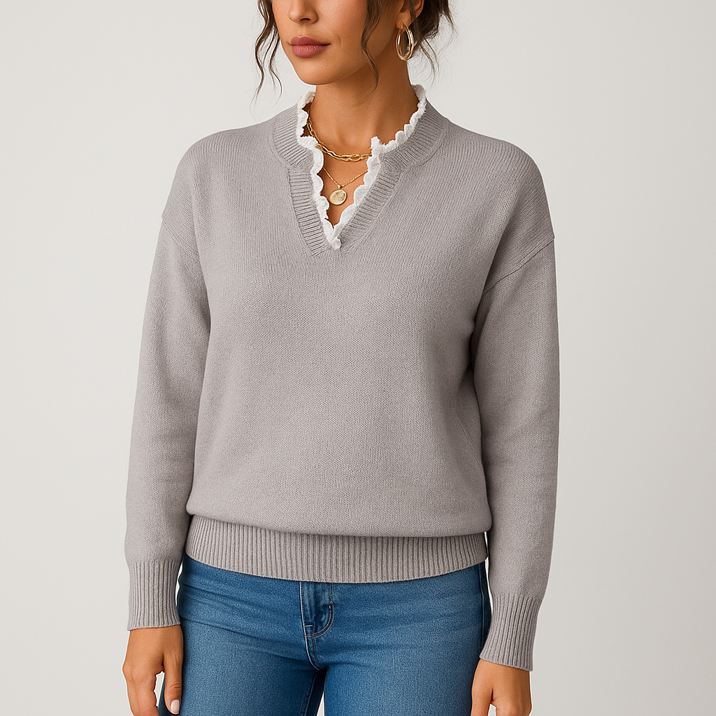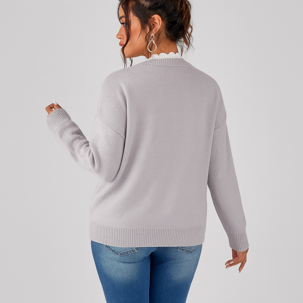 De Emile gebreide trui met kant combineert tijdloze elegantie met gezellige comfort – perfect voor vrouwen die van stijl en vrouwelijkheid houden.